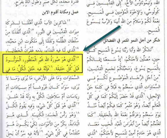 وأيضاً نراجع النص الموجود في رؤيا يوحنا اللاهوتي 3 / 14 فتجده يقول (واكتب الى ملاك كنيسة اللاودكيين.هذا يقوله الآمين الشاهد الامين الصادق بداءة خليقة الله )نرجع للترجمة الجديدة تجدها ( أصل خليقة)