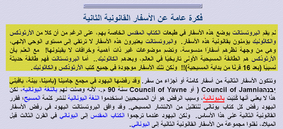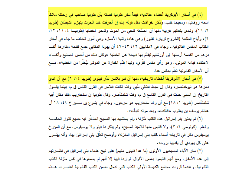 (الأبوكريفا هي الكتب المشكوك في صحة نسبتها إلى من تُعزى إليهم من الأنبياء ....وقد رفضوا هذه الكتب في مجمع جامينا (90م) لأنها غير موحى بها..... إن لغتها ليست العبرية التي هي لغة أنبياء بني إسرائيل ولغة الكتبالمنزلة، وقد تأكدوا أن بعض بني إسرائيل كتب هذه الكتب باللغة اليونانية............ في أسفار ال فيأسفار الأبوكريفا أخطاء عقائدية) انتهى