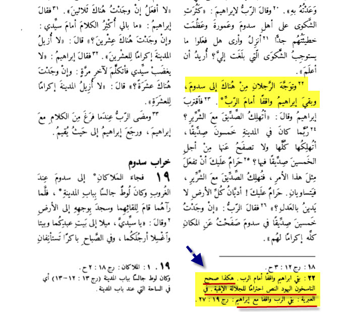 (هكذا صحح الناسخون اليهود النص احتراما للجلالة الالهية فى العبرية بقى الرب واقفامع ابراهيم)